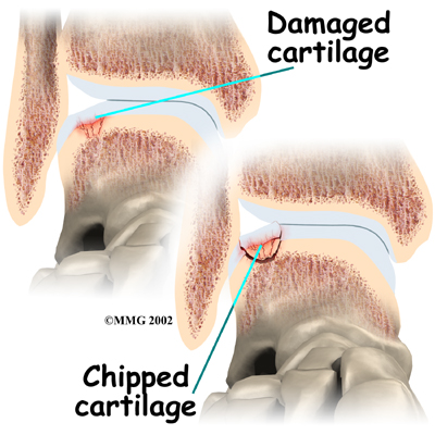 Injury to a joint, such as a bad sprain or fracture, can cause damage to the articular cartilage. The cartilage can be bruised when too much pressure is exerted on it. This damages the cartilage, although if you look at the surface it may not appear to be any different. The injury to the material doesn't show up until months later. Sometimes the cartilage surface is damaged even more severely, and pieces of the cartilage are ripped from the bone. These pieces do not heal back and usually must be removed from the joint surgically. If not, they may float around in the joint, causing the joint to catch and be painful. These fragments of cartilage may also do more damage to the joint surface.
