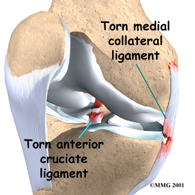 If an injury causes these ligaments to stretch too far, they may tear. The tear may occur in the middle of the ligament, or it may occur where the collateral ligament attaches to the bone, on either end. If the force from the injury is great enough, other ligaments may also be torn. The most is a tear of the MCL and a tear of the anterior cruciate ligament (ACL). The ACL runs through the center of the knee and controls how far forward the tibia moves in relation to the femur.
