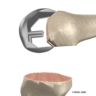 This cutting guide is used to ensure that the bone is cut in the proper alignment to the leg's original angles, even if the arthritis has made you bowlegged or knock-kneed. With the help of the cutting guide, the surgeon cuts several pieces of bone from the end of the femur.